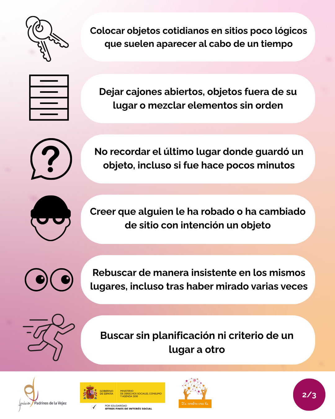 Habitualmente esta pérdida de objetos viene acompañada de revolver cajones, armarios… sin orden ni criterio para encontrarlo. Además, es disruptivo y molesto para la convivencia pudiendo convertirse en peligroso para la persona.